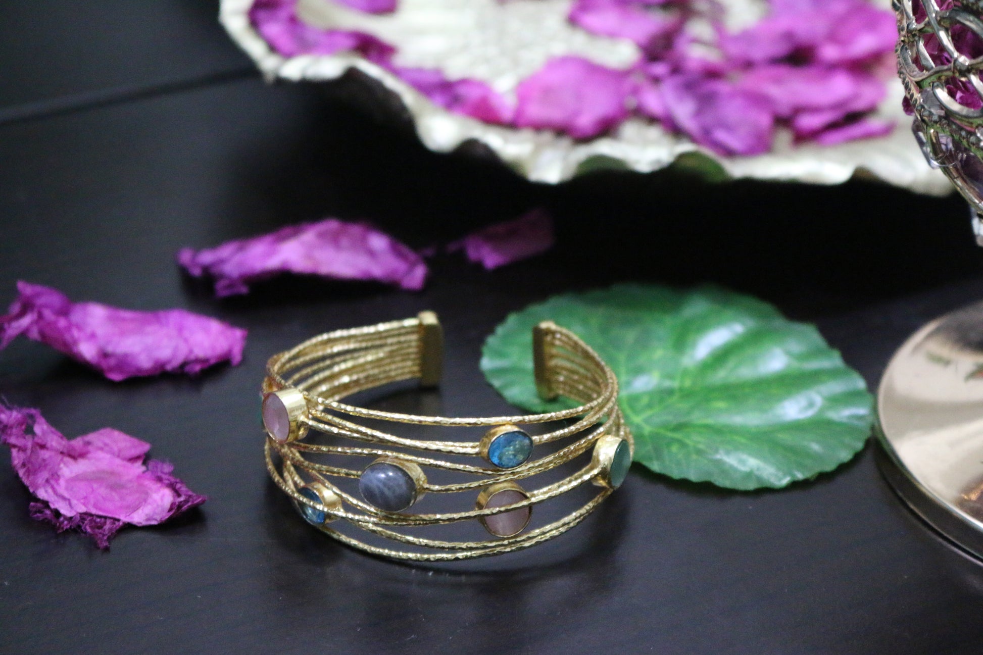 Adorn your wrist with this sophisticated hand cuff, featuring an exquisite blend of multi coloured gemstones that radiate refined elegance.