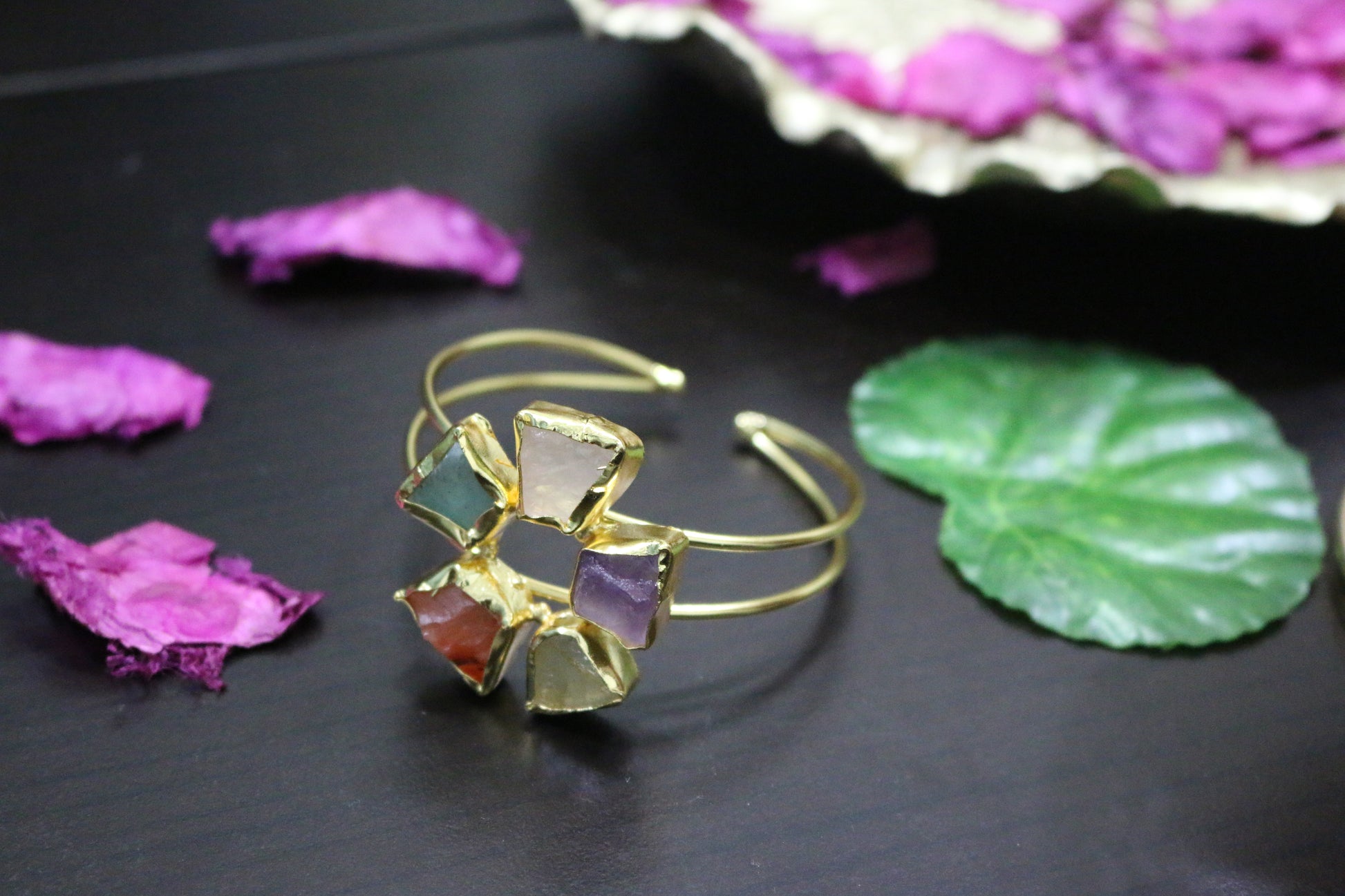Crafted from natural stone, this five-petal crystal hand cuff showcases a captivating blend of multiple hues. The adjustable design ensures a comfortable fit for various wrist sizes, making it a versatile accessory that adapts to your personal style.