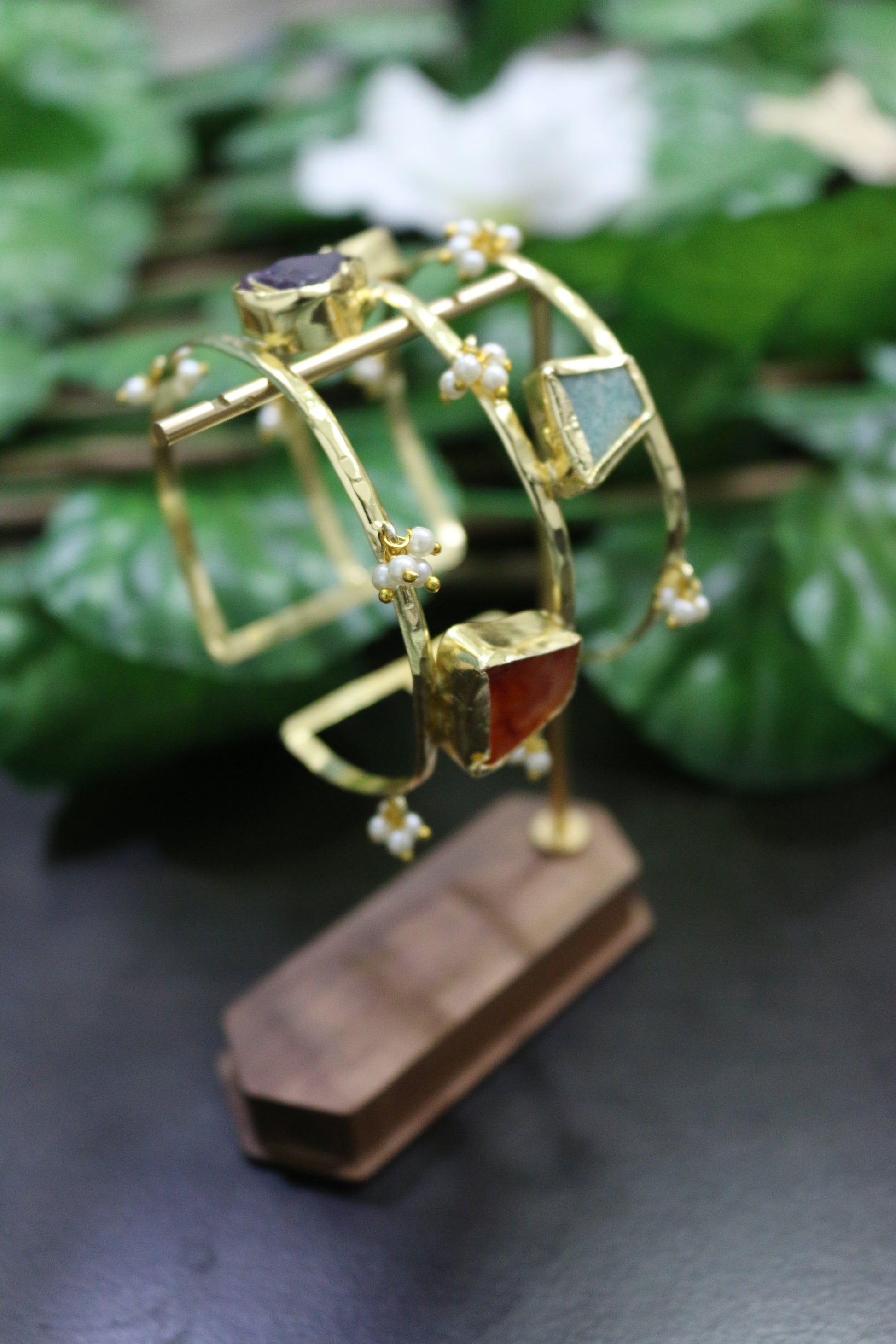 Make an impression with this striking two-layer hand cuff, expertly crafted from polished brass in warm gold tones. Adorned with vibrant natural stones in multiple hues and delicate pearl beads
